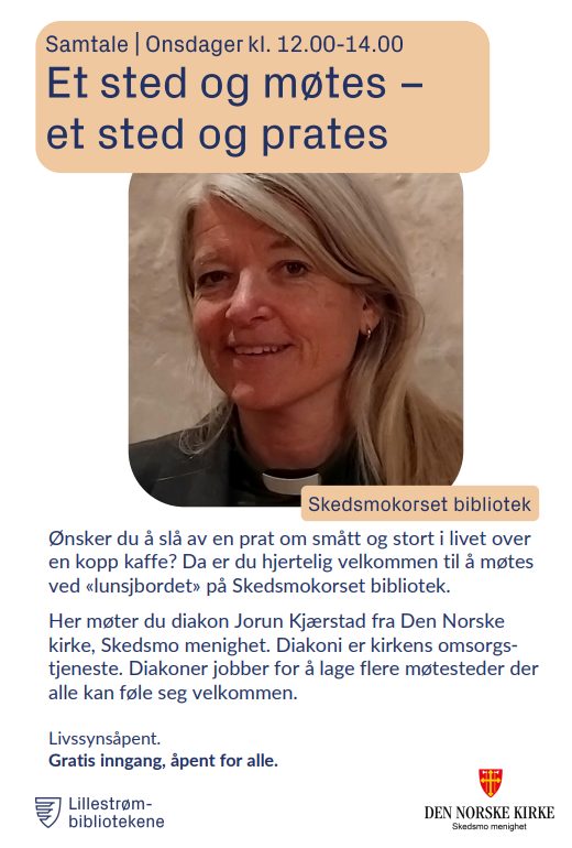 Her møter du diakon Jorun Kjærstad fra Den norske kirke, Skedsmo menighet. Diakoni er kirkens omsorgstjeneste. Diakoner jobber for å lage flere møtesteder der alle kan føle seg velkommen.