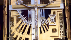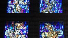 Kirketekstilene på veggen veksler med kirkeåret. De er vevet av Askerkunstneren Molle Cecilie Major.