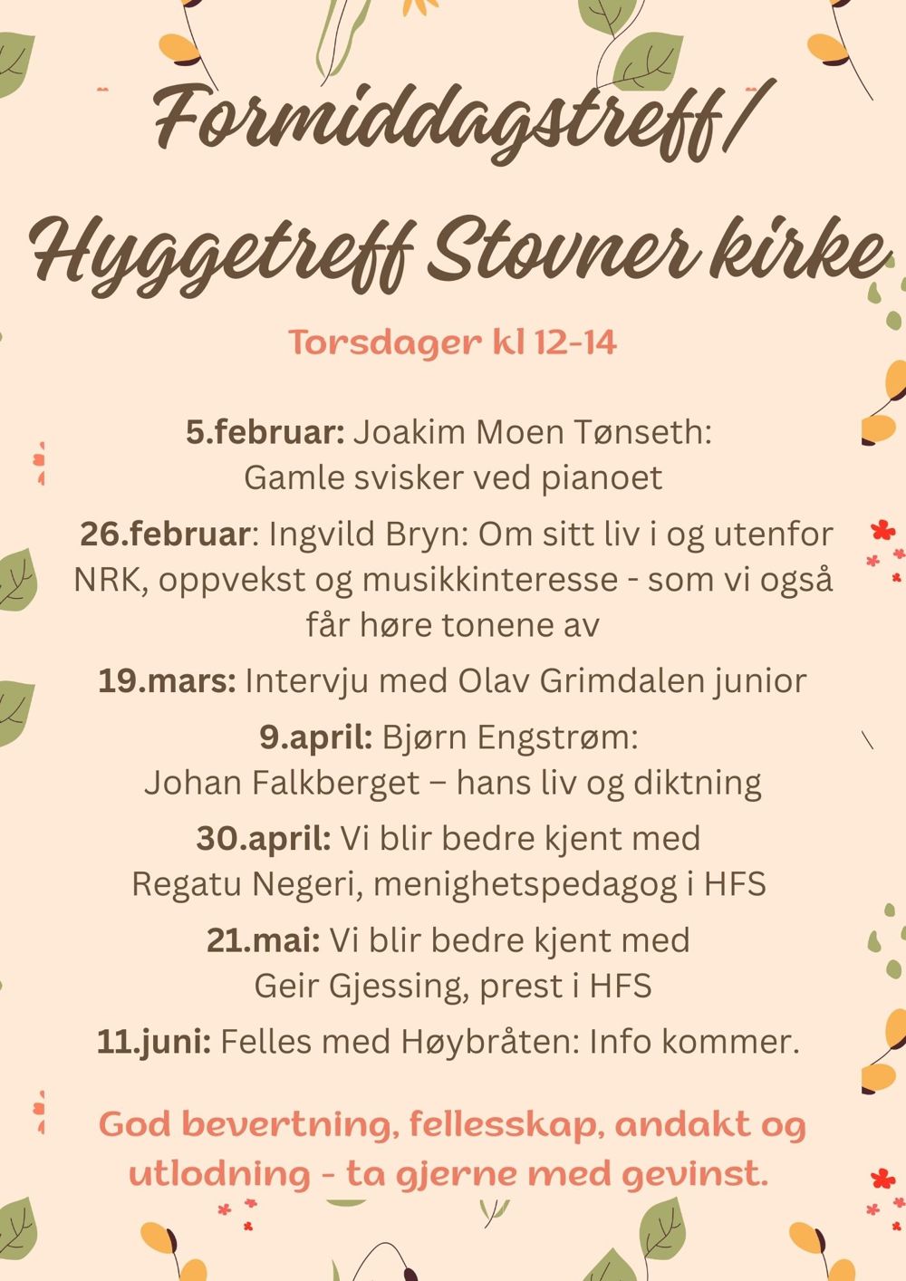 Formiddagstreff/Hyggetreffene er på torsdager kl. 12 til 14. Variert program og et godt fellesskap og i tillegg er det god bevertning og loddsalg. Datoene finner du nedenfor.
