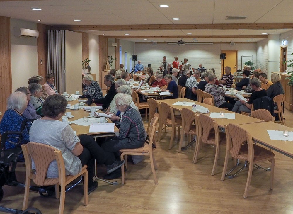 Kafeen (inngang fra garderobe) - 63 kvm. Står ferdig oppsatt med bord, stoler etc. Egner seg til møter, minnesamvær o.l. med inntil 50 deltakere.