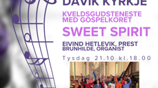 1.10.2025Tysdag 21. oktober vert det kveldsgudsteneste med gospelkoret Sweet Spirit i Davik kyrkje kl. 18:00.