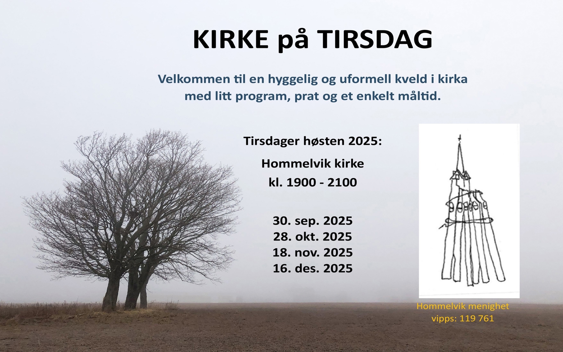Velkommen til en hyggelig og uformell kveld i kirka med litt program, prat og et enkelt måltid.