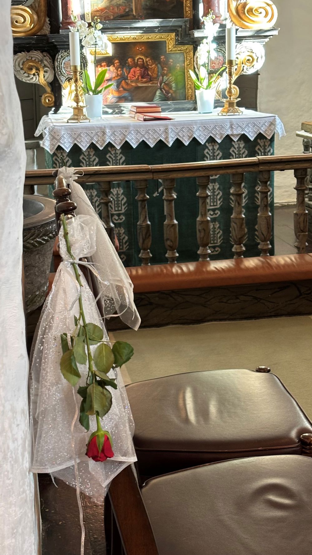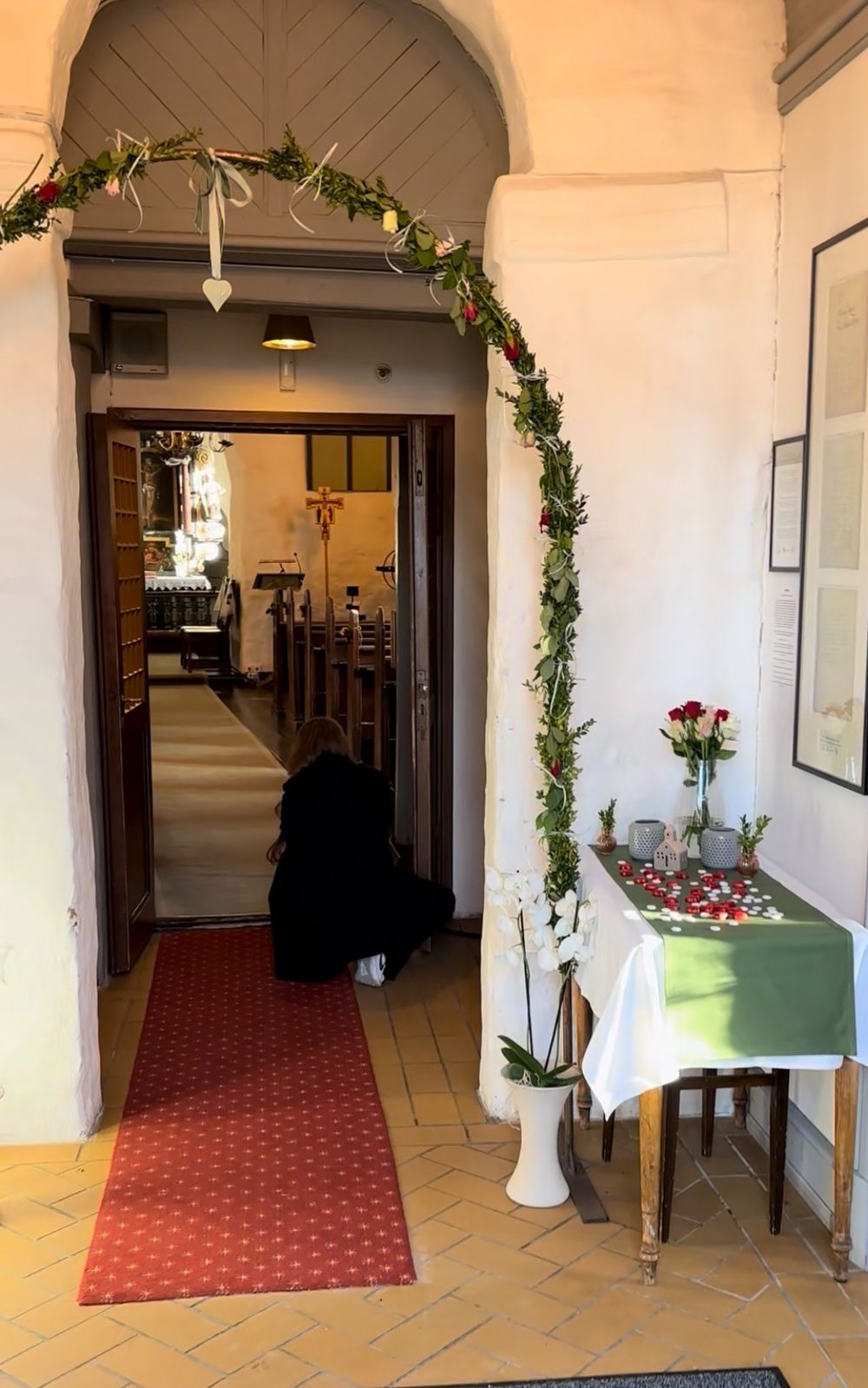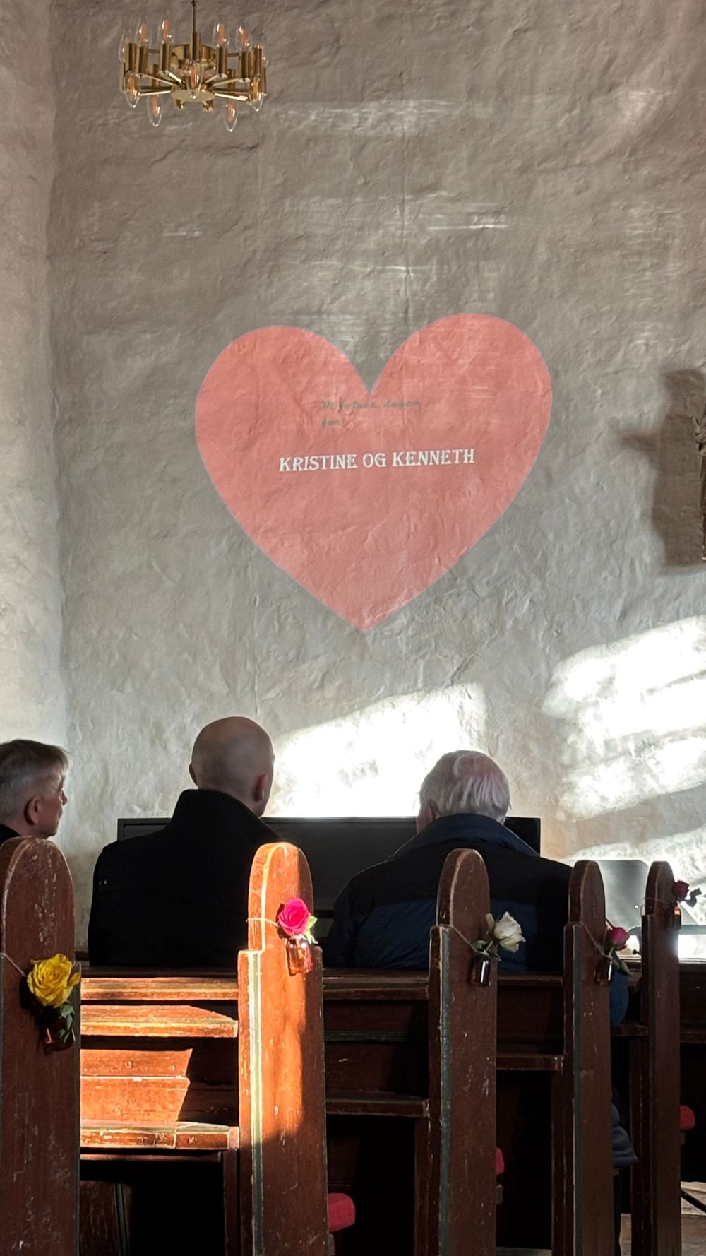 Røde sjokoladehjerter og sukkertøy i våpenhuset, vakre roser og hvit tyll på stoler og kirkebenker. Du er ikke i tvil om at det er bryllup på gang når du kommer inn i Gamle Glemmen kirke på Valentinsdagen.