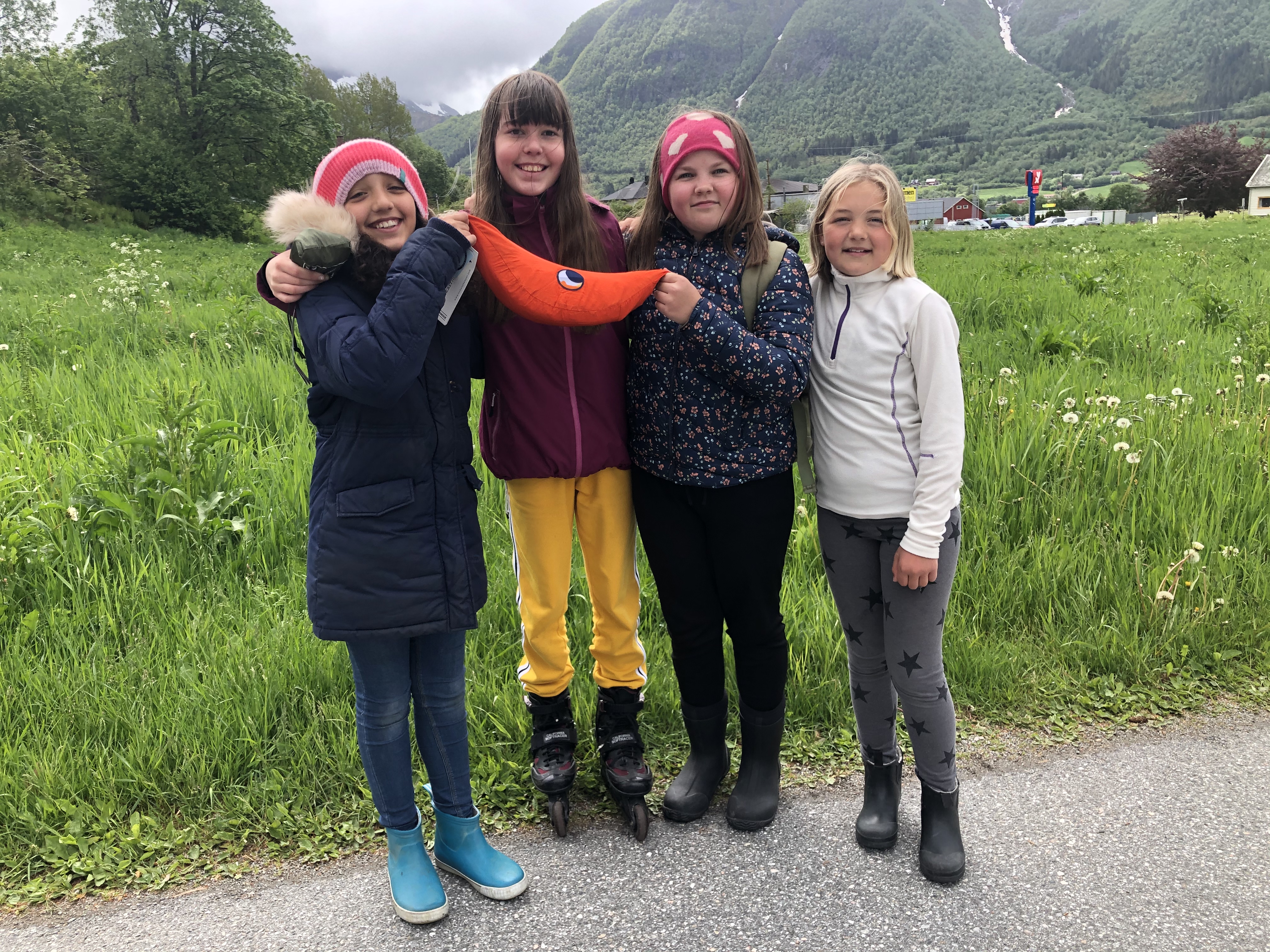 Her er den heldige vinnaren med hengekøya framfor seg, ilag med vennar
