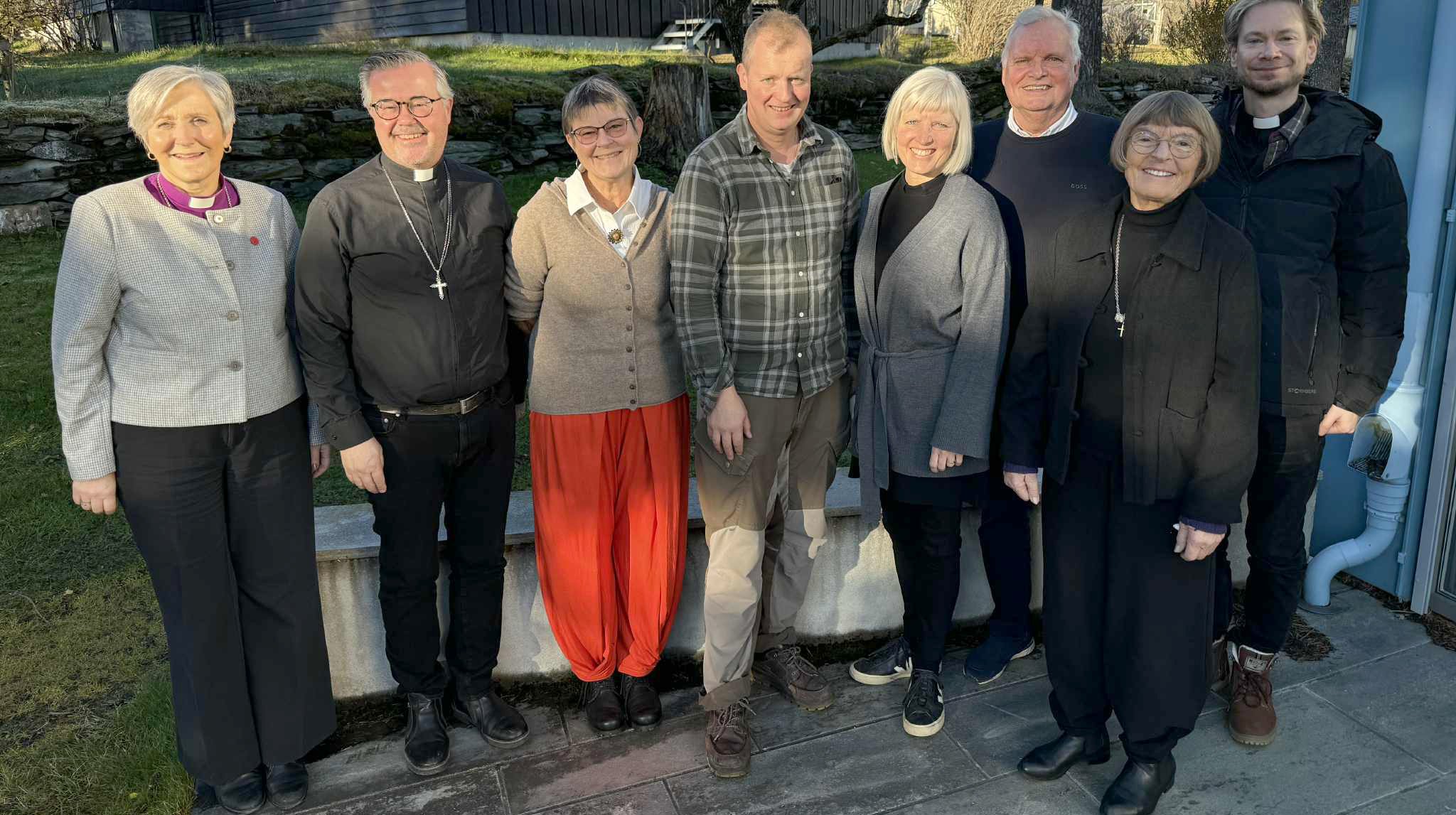 Biskop Herborg Finnset og kapellan Tord Thuen sammen med deltakere på formiddagstreff i Kolstad kirke (Foto: Aud Kristin Saltvik Aasen)
