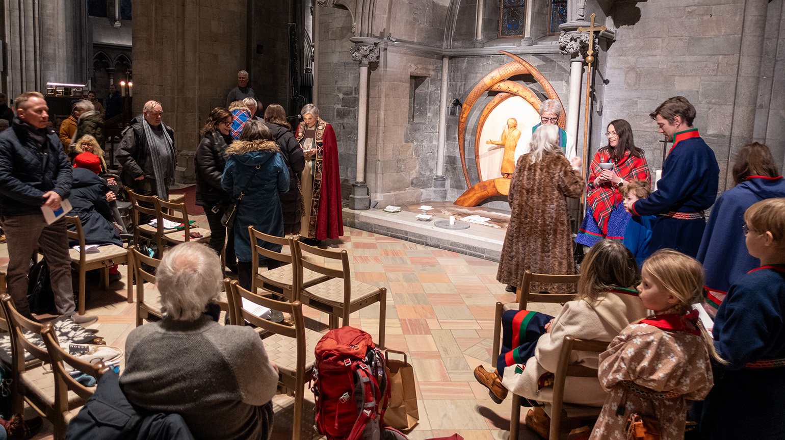 Mange hadde samlet seg rundt det samiske alteret i Nidarosdomen til fellesskap, sang og nattverd. Prest i Nidarosdomen Torstein Amundsen ledet gudstjenesten sammen med biskop Herborg Finnset. Diakonene Bertil Jönsson (Saemien Åålmege) og Mari Kristine Brækken (Nidaros domkirke) hadde lesningene, kantor Thomas Weysser var musikalsk ansvarlig og KorDiale fra Vår Frue kirke møtte menigheten med korsang.
