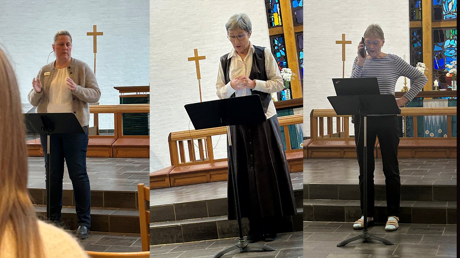 Foredragsholderne under fagdagen om sorg i Hoeggen kirke. Fra venstre: Ingvild Hammernes, Hilde Anette Løvenskiold Grüner og Sølvi Rise (Foto: Tina Solbakken)