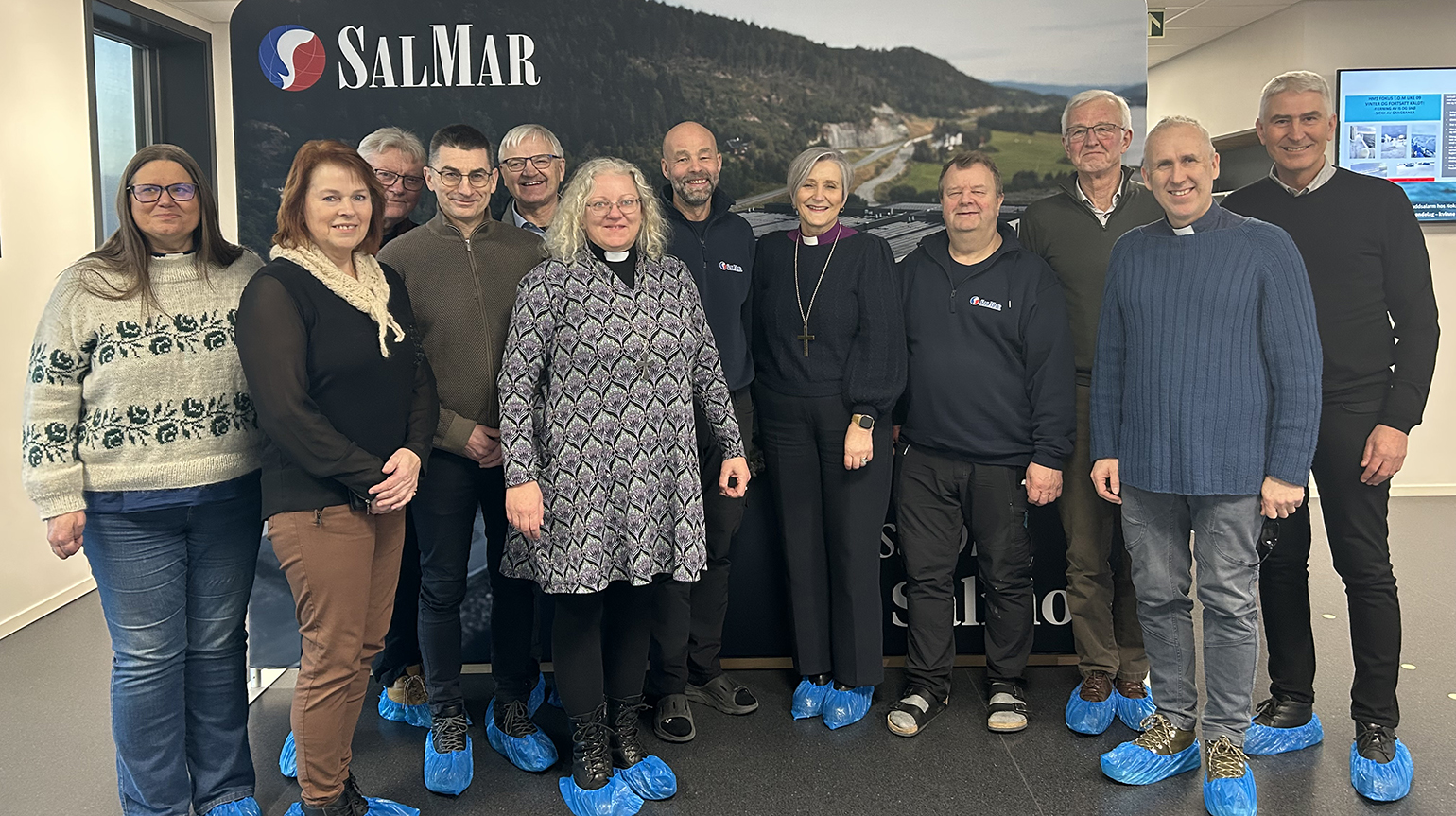 Biskopen fikk omvisning på Salmars nye settefiskanlegg i Malm og fikk møte representanter for næringslivet i bygda.