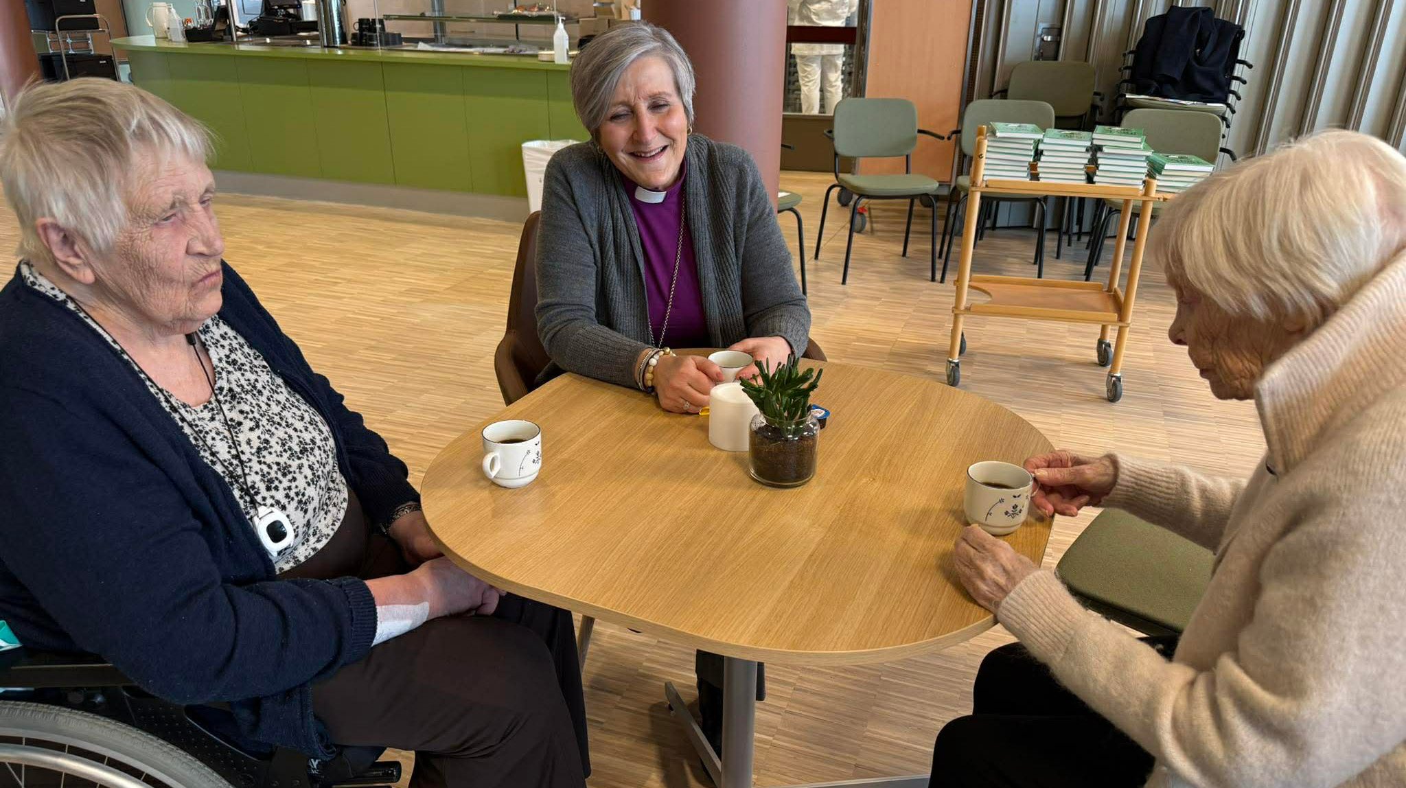 Biskop Herborg i trivelig kaffeprat på Meldal helsetun (Foto: Aud Kristin Saltvik Aasen)