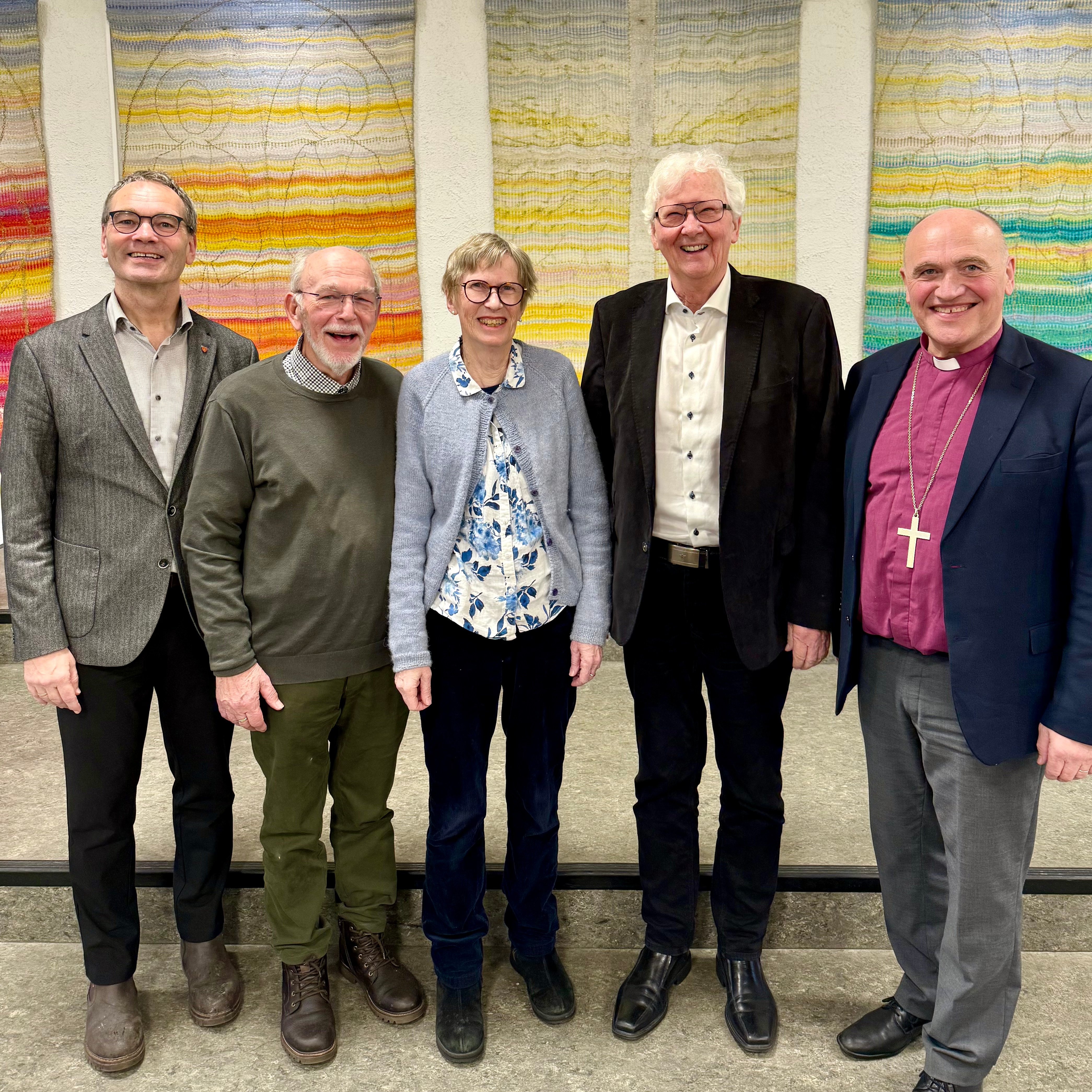 Stiftsdirektør Eigil Morvik (f.v.), Nils Magnus Hovland, Solveig Aass Kristiansen, David Gjerp og biskop Jan Otto Myrseth.