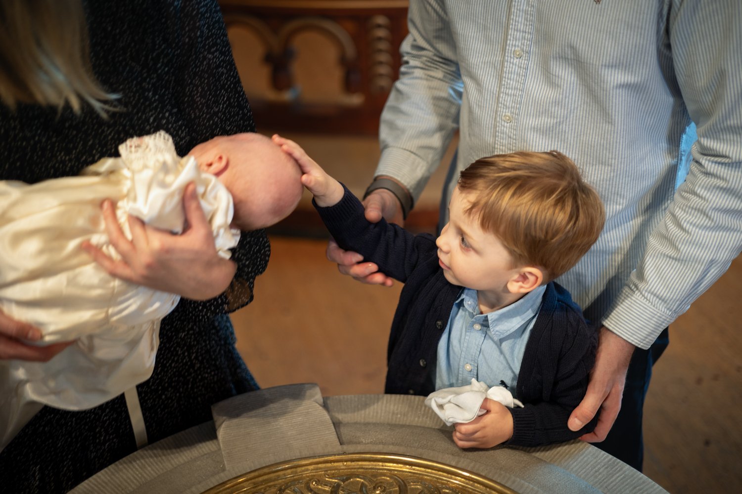 Lille Magnus (2 mnd) skal prøve dåpskjolen. Storebror Fredrik (snart 2 år) utforsker døpefonten sammen med pappa.