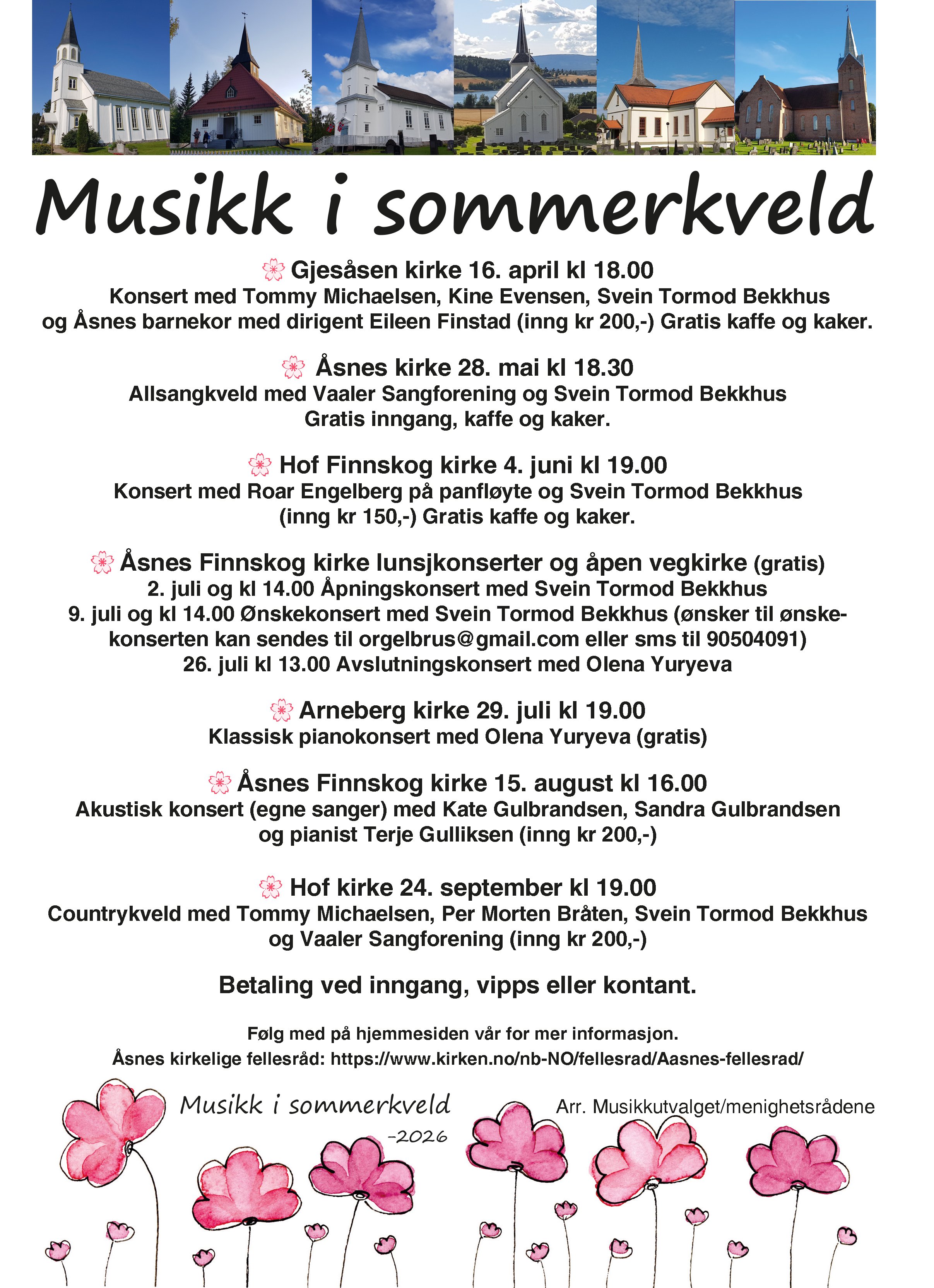 Her har vi samlet lokale musikere sammen med våre organister, og inviterer til en musikkopplevelse i alle kirkene i kommunen gjennom sommerhalvåret.
