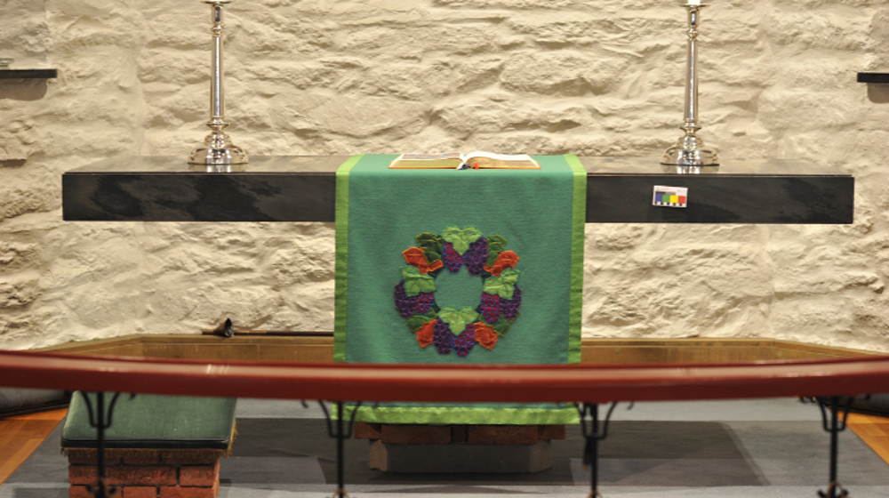 Alterring fra 1961. Buet front, rette sidepartier. Bred knelepute trukket med grønn fløyel. Bred, flat håndlist med plass til særkalker. Tynne smijerns sprosser prydet med gjennombrutte firbladsroser.