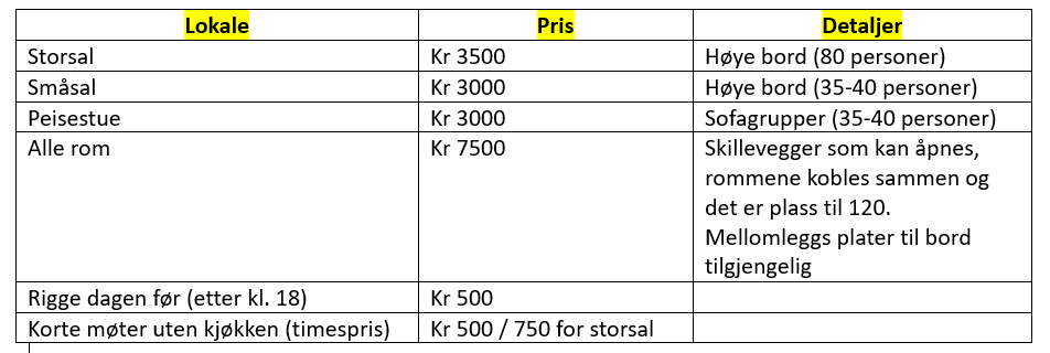 Nye leiepriser gjeldende fra 1/1-24: Alle rom er inkludert kjøkken. Tidspunkt for rigging/dekking dagen før avtales ut fra kapasitet/andre leieavtaler. Vanligvis etter kl. 18.