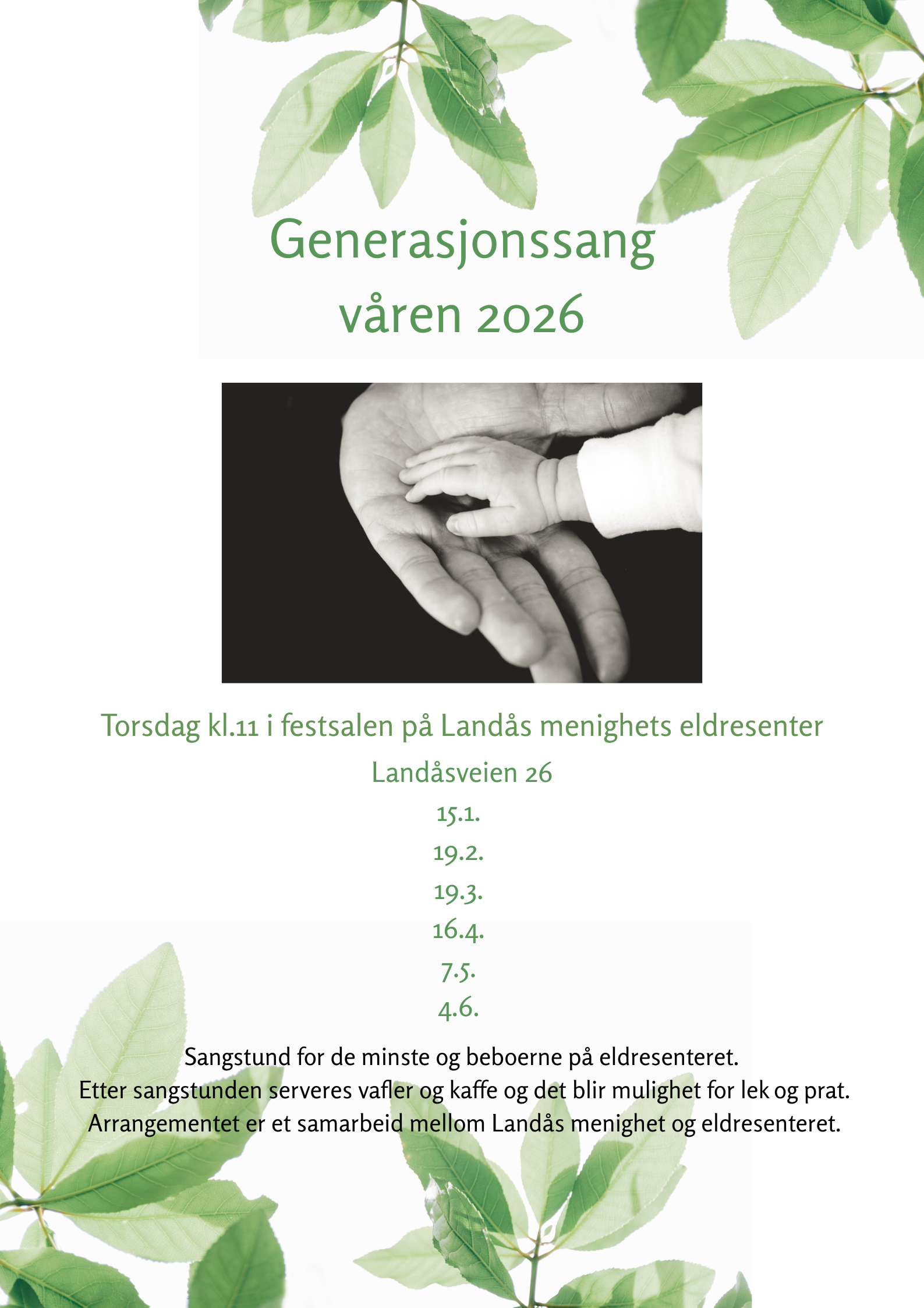 Generasjonssang foregår kl.11 i festsalen på Landås menighets eldresenter i Landåsveien 26. Det er for de helt minste, sammen med beboerne på Landås menighet eldresenter.