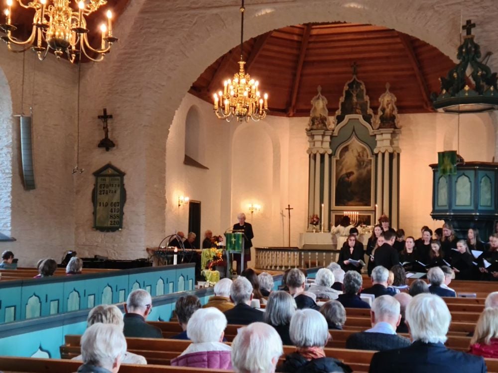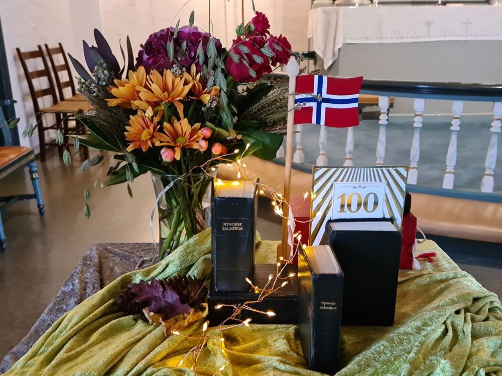 I år er det 100 år sidan Nynorsk salmebok kom ut. Sjølv om boka ikkje er så mykje i bruk lenger, har ho vore særs viktig for å ta vare på den nynorske salmeskatten og fremja nynorsk salmesong. Dei to nynorsk-kyrkjelydane i Bergen, Arna og Ytre Arna, gjekk saman om ei felles gudsteneste i Arna kyrkje for å markera jubileet. Noregs mållag sentralt og lokalt var med - i gudstenesta deltok dei med tekstlesing, og biskop Ragnhild Jepsen preika og lyste velsigninga. Koret Stemmer deltok. Kyrkjetenaren vår, Monica Ohr, hadde pynta kyrkja til fest. Gudstenesta vart overført på NRK.