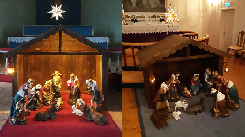 13.12.2020I begge kirkene våre, Grue og Grue Finnskog, er det blitt satt opp helt nye julekrybber.
