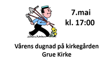 24.4.2020Torsdag 7.mai 2020 fra kl. 17.00 møtes vi til vårens dugnad på kirkegården Grue Kirke.