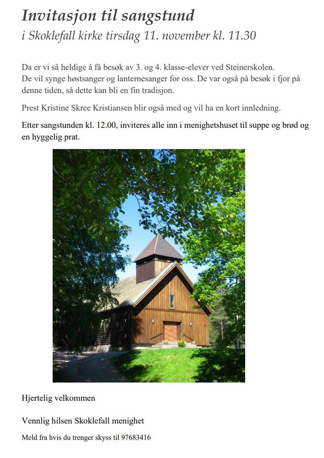 Tirsdag 11. november kl. 11.30 - Skoklefall kirke