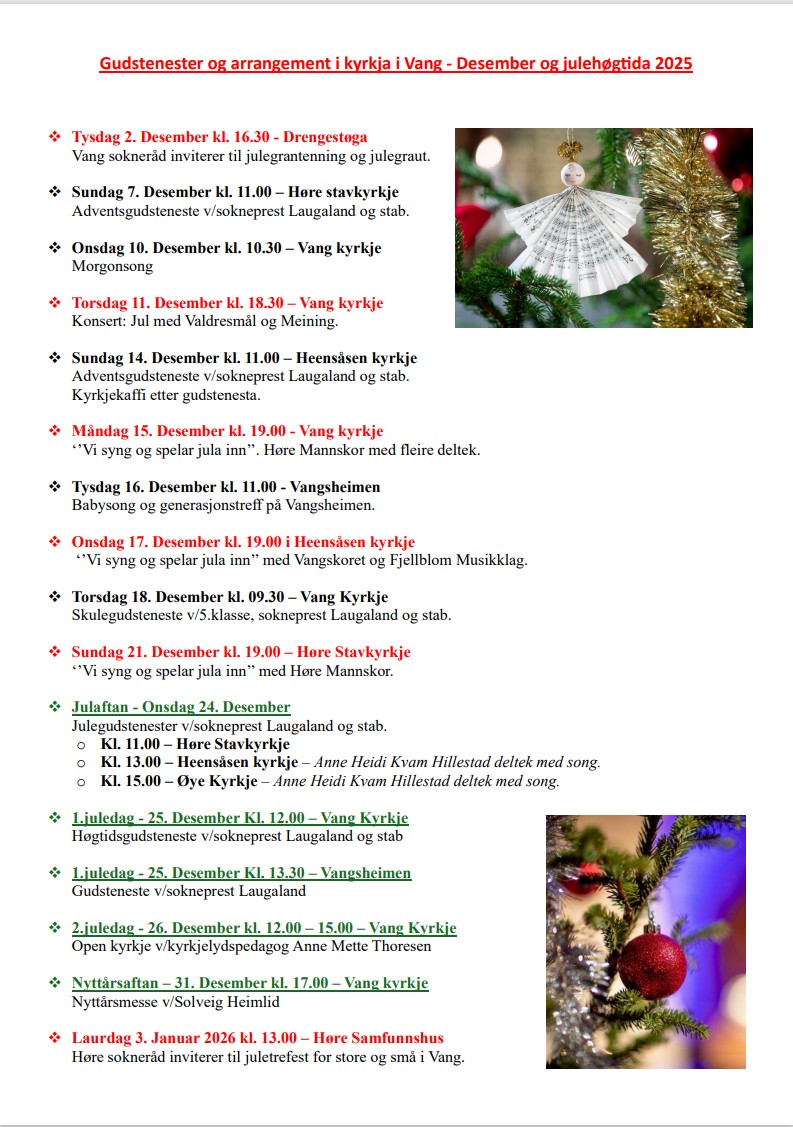 Lurer du på kva som skjer i kyrkja i Vang i adventstida og julehøgtida som snart kjem? Her finn du ei lita oversikt.
