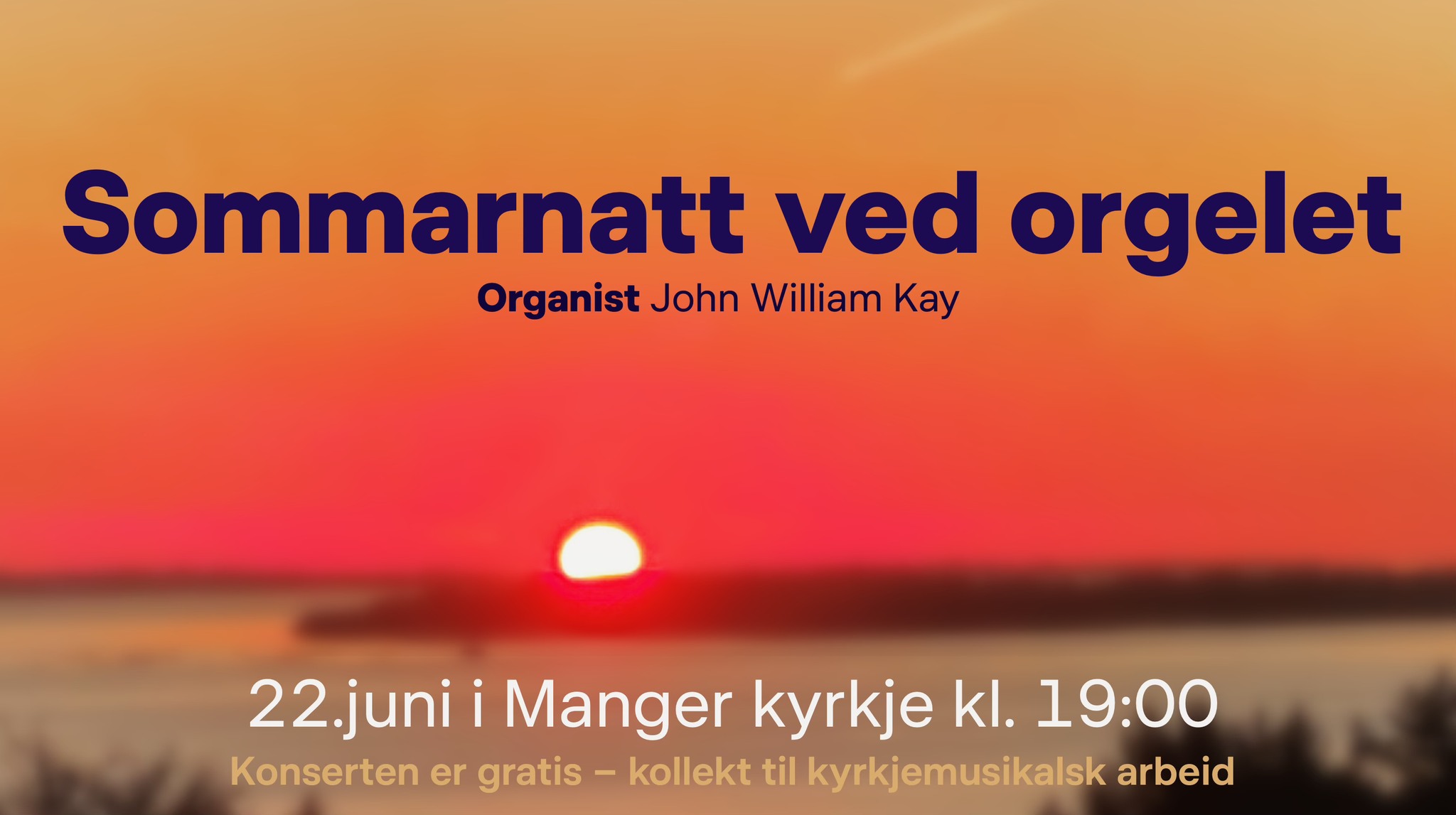 31.5.2024Laurdag 22.juni kl. 19:00 innbyr organisten vår William Kay til sommarkonsert i Manger kyrkje.