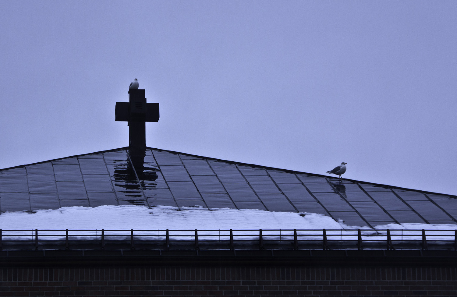 Kirketekstilene på veggen veksler med kirkeåret. De er vevet av Askerkunstneren Molle Cecilie Major.
