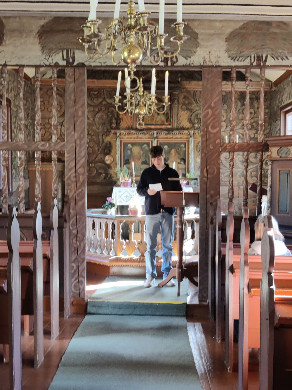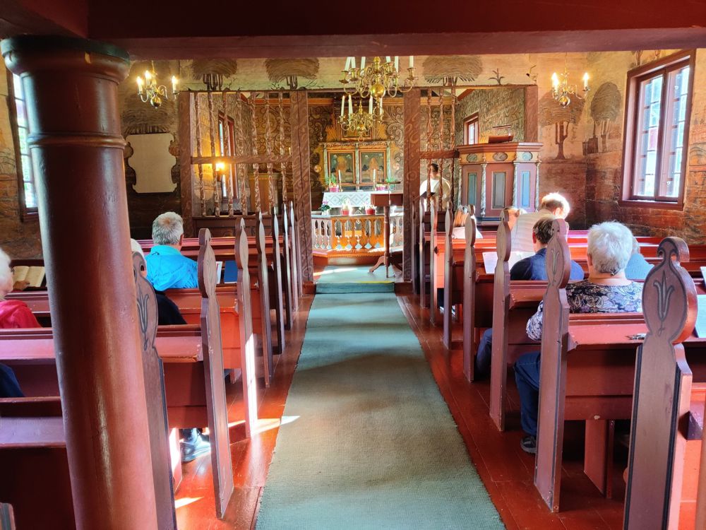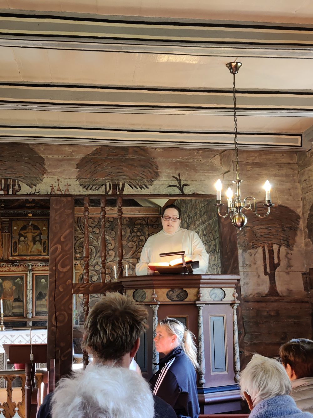 Bilde frå gudstenesta i Flåm kyrkje ved prestevikar Nora Baartvedt. Organist Sverre Martin Volle. I dag feira me hausttakkefest. Konfirmantane gjorde ein kjempejobb med å ringe inn, lese tekst og hjelpe til med nattverd. Etter gudstenesta var det kyrkjekaffi i kyrkjestova med utlodding av grønsaker og blomar. Takk til Jorunn og Berit som laga som laga til kaffi, kaker og pynta