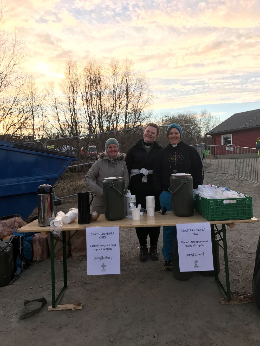 Tidligere år har ansatte og frivillige fra Hunstad kirke vært på russecampen i Mørkvedbukta med suppe og tilstedeværelse. Vi ønsket å gjøre det samme i år, og var tilstede med varm suppe og en bålpanne. Dette satt russen stor pris på, og bålpannen ble et naturlig samlingspunkt for å slå av prat, særlig når temperaturen sank utover natten. Vi møtte på så mange fine ungdommer som var veldig takknemlige når de fikk en kopp suppe eller litt vann.