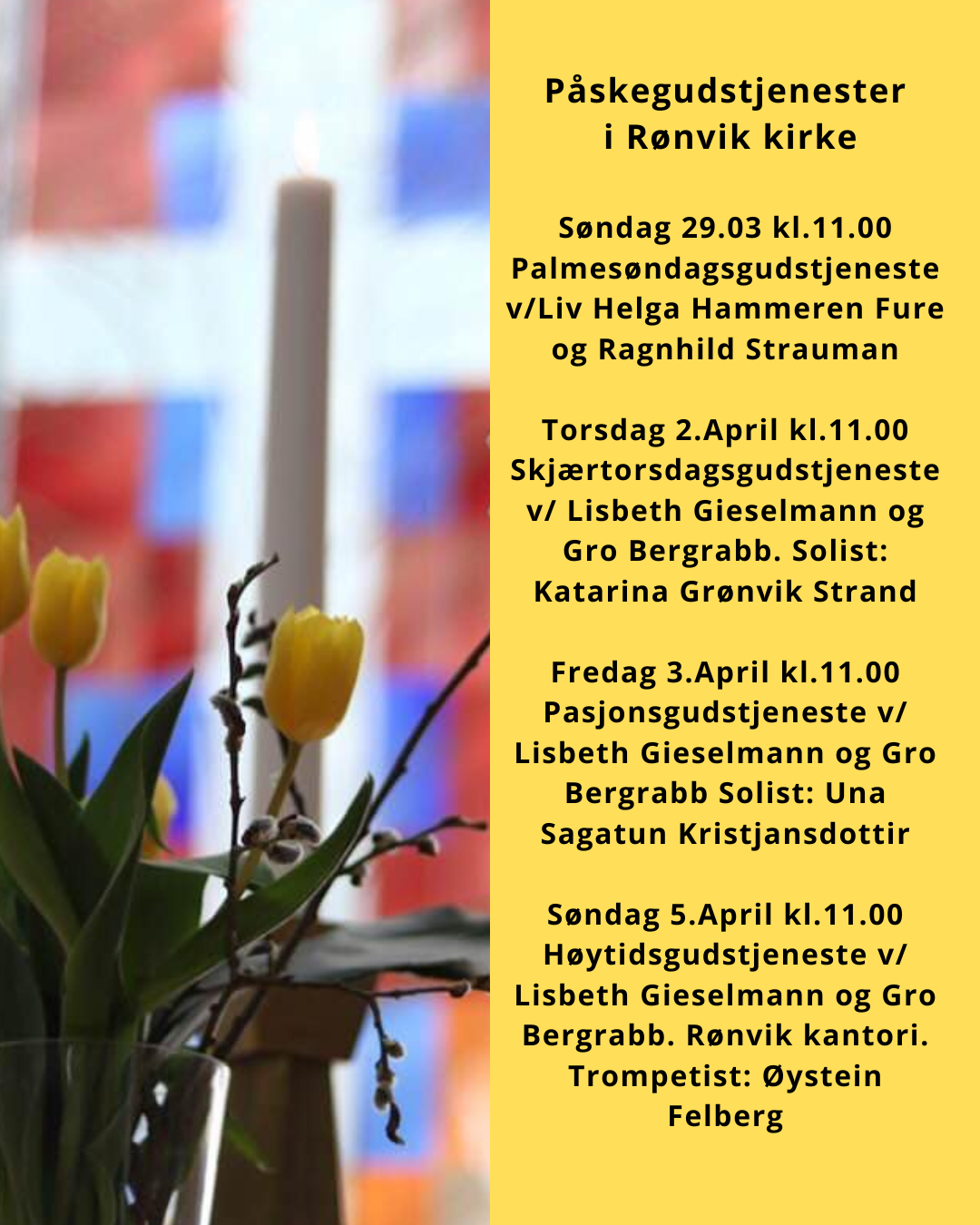 Varmt velkommen til Rønvik kirke i påskehøytiden! Vi gleder oss til å dele påskens budskap i ord og toner fra palmesøndag til skjærtorsdag, langfredag og påskedag!