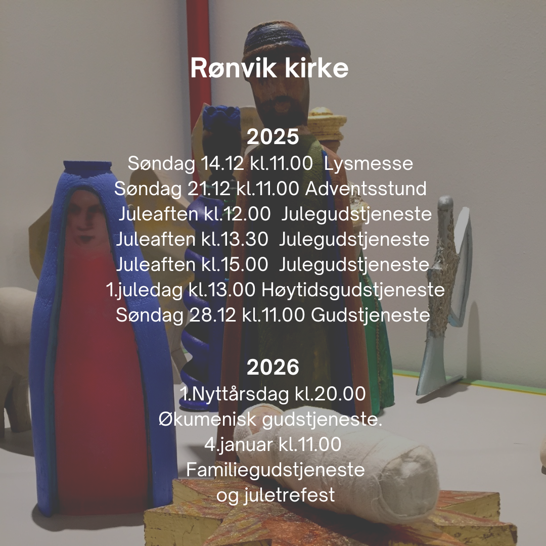 Velkommen til gudstjeneste i Rønvik kirke! Her finner du oversikt over desember 2025 og begynnelsen av januar 2026. Videre oversikt finner du på skjerikirken.no.