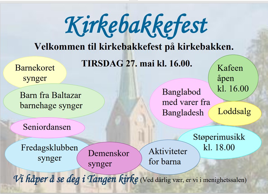 På grunn av været flyttes Kirkebakke-festen inn i kirken og Arbeidskirken. Velkommen til Kirkebakkefest