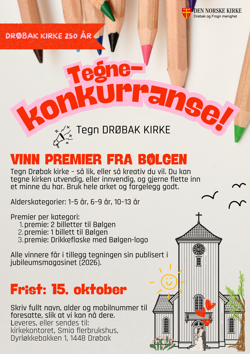 I 2026 fyller Drøbak kirke 250 år, og i den anledning steller vi i stand et jubileumsmagasin som slippes i januar, 2026. I forkant av magasinslippet har vi en tegnekonkurranse for barn, hvor foresatte sender inn barnas tegninger av Drøbak kirke.