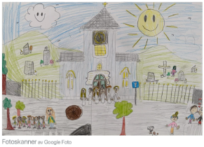 Stor flott tegning, sammensatt av 9 A4-ark! Her er det arbeidet og planlagt godt! Kirken er friskt og ledig tegnet, med gjenkjennelige elementer som vinduer og tårnet med klokken.Trær og blomster utenfor gjør bildet fargerikt og godt. Man får en herlig perspektivfølelse av treet som ruver til høyre for kirken. Hjertene i vinduene gir kjærlig varme. Og over det hele svever et spøkelse? Eller en engel? Eller Den hellige ånd?
