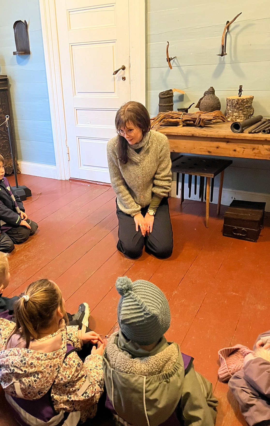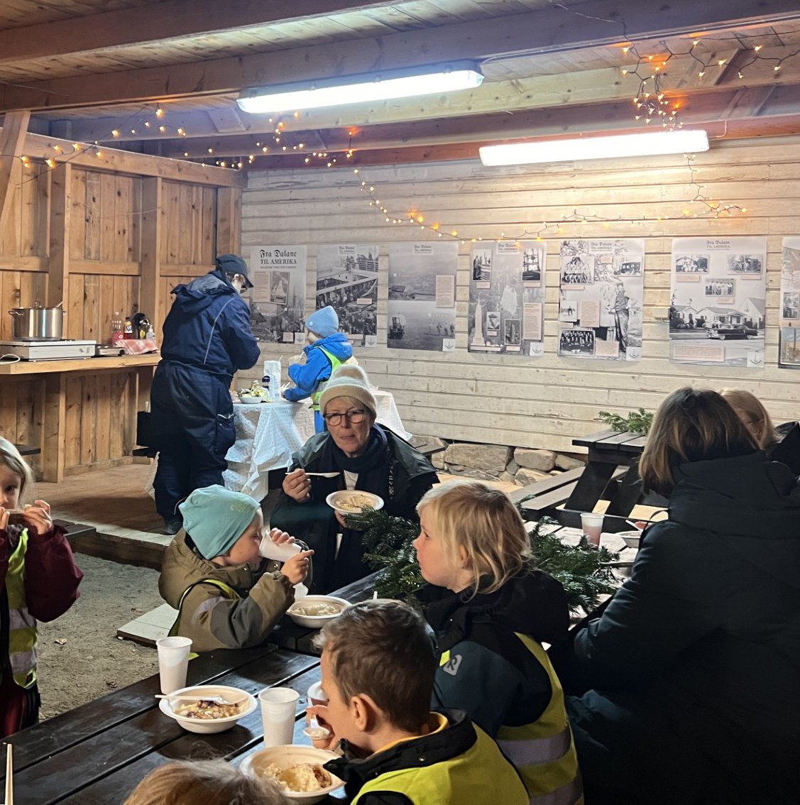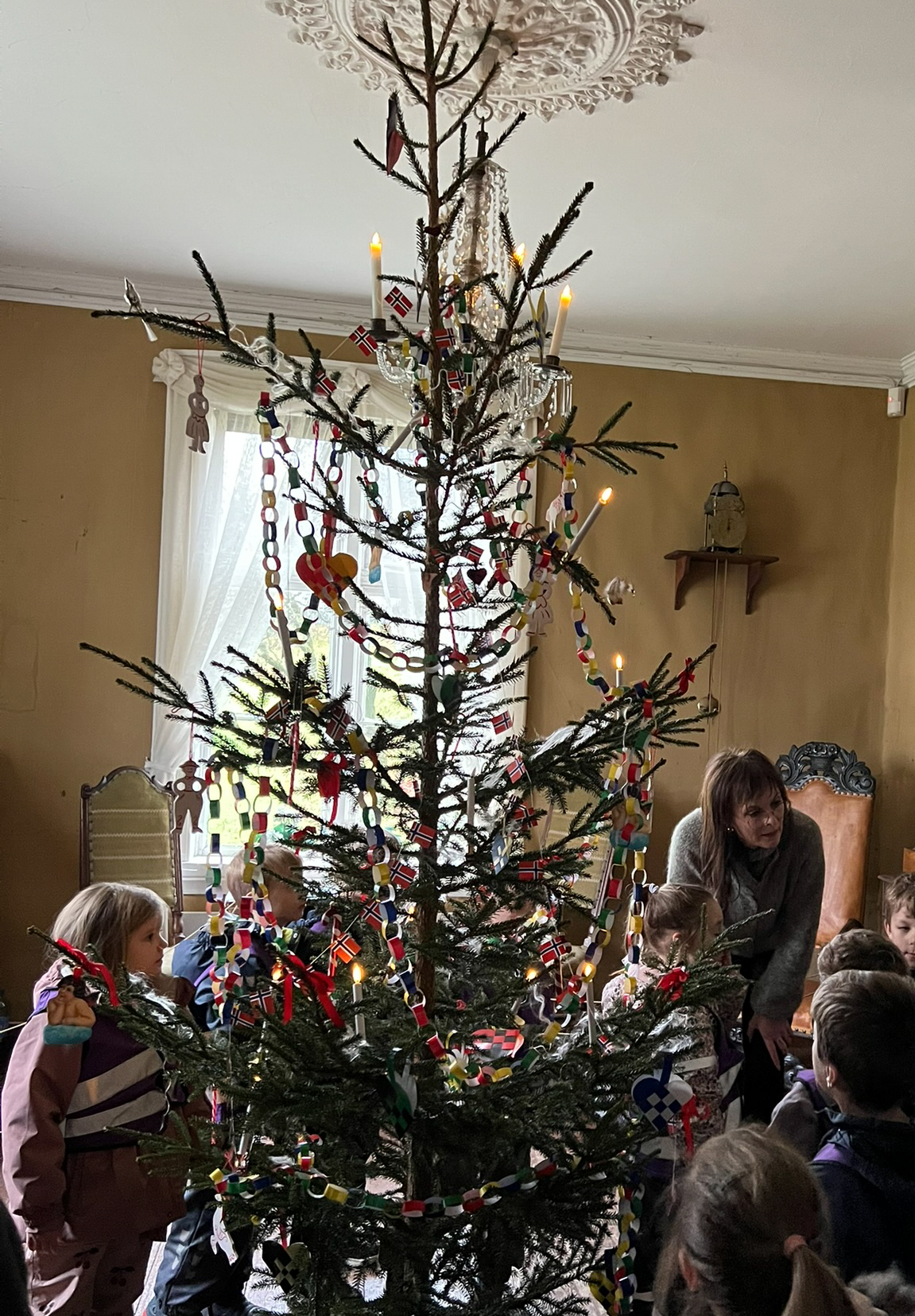 Videre har vi gått ned i museumshagen der vi har delt oss i grupper. Alle har etter tur fått spise grøt på loven, dyppe lys i vognskjulet, og fått høre om gamle lyskilder i hovedhuset. I tillegg har alle fått høre om gamle juletre tradsjoner, og vi har gått rundt juletreet til glede for både små og store.