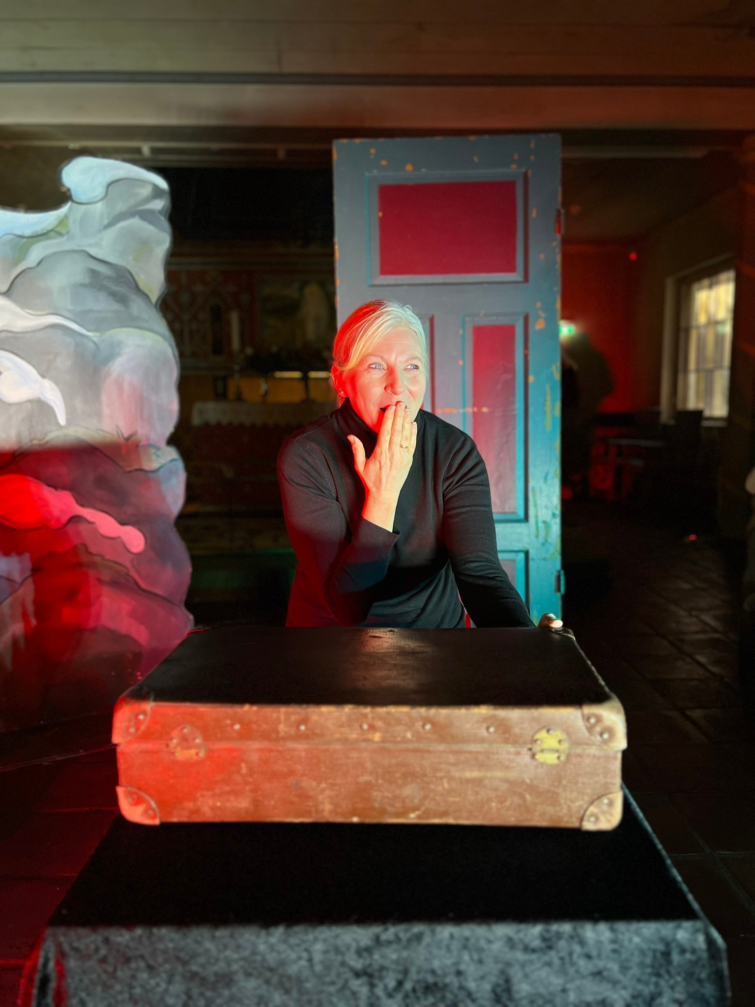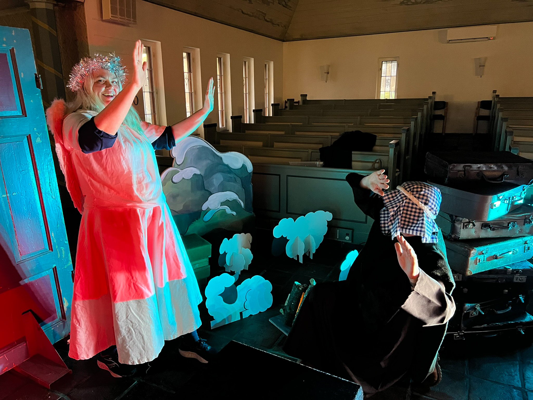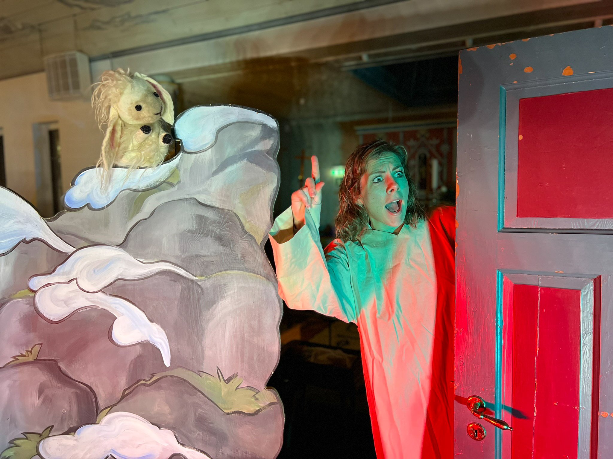 Siv Grethe har laget kulisser, og gir liv til sauen Langøre.