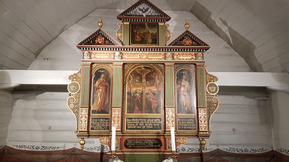Altertavlen var en gave fra lensherren Jørgen Kaas og hustru Mette Banner. I gavlfeltene finnes deres våpenskjold og initialer. Sentralbildet er korsfestelsen. Sidefeltene betegner troen (fides) og håpet (spes). Paulus var som kjent troens apostel, og Peter håpets. I toppfeltet er Jesu dåp.