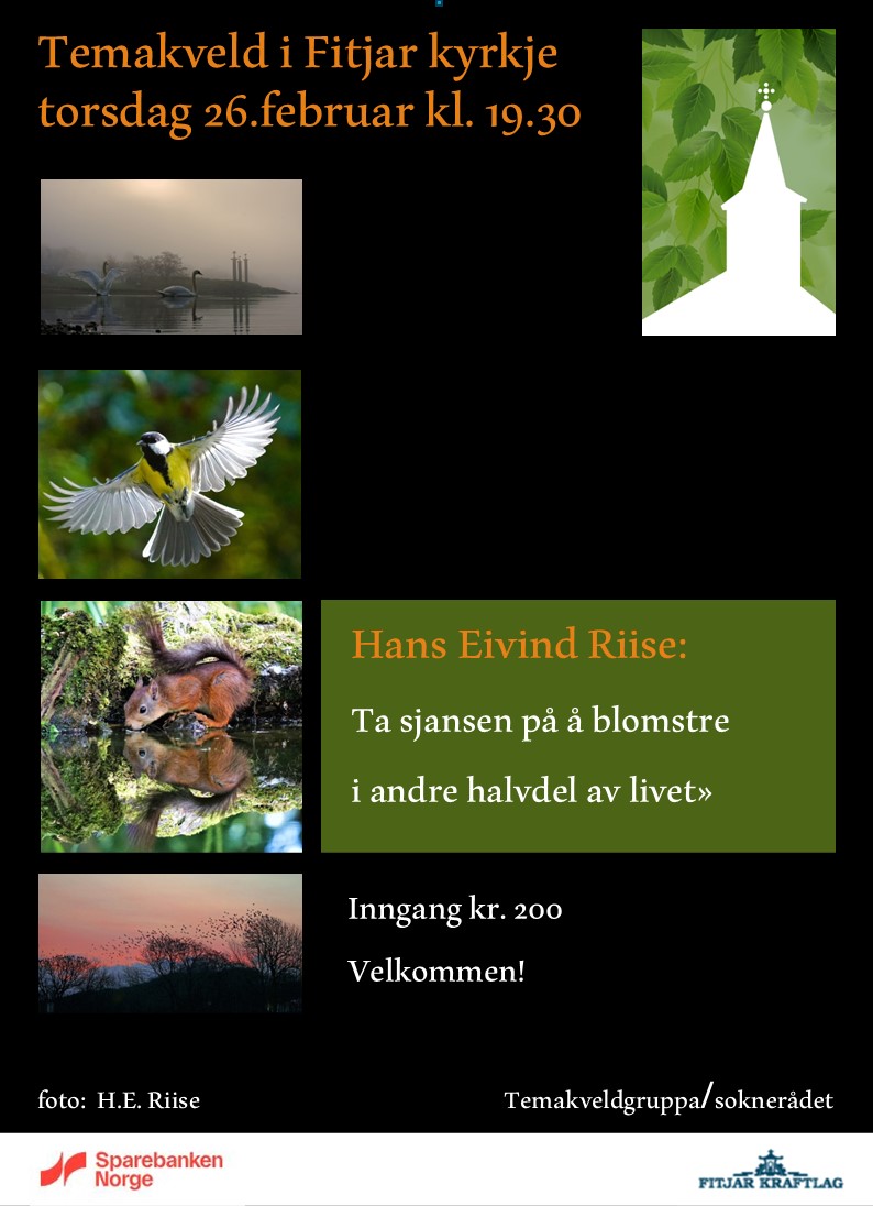 Torsdag 26. februar kjem Hans Eivind Riise og oppmodar oss om å «Ta sjansen på å blomstre i andre halvdel av livet!» Han nyttar enneagrammet som ein analyseredskap når det gjeld å bli kjend med dei ulike personlegdomstypane. Dette er eit felt han har undervist i gjennom mange år, og som for svært mange har ført til vekst og innsikt. Han illustrerer og døma med song og bilete.