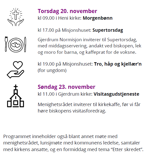 Biskop Kari Alvsvåg kommer til Gjerdrum på visitas i 18.-23. november, og vi gleder oss. Sammen med biskopen kommer også kirkefagsjef Dag-Kjetil Hartberg og prost Liv Berg Krohn-Hansen.