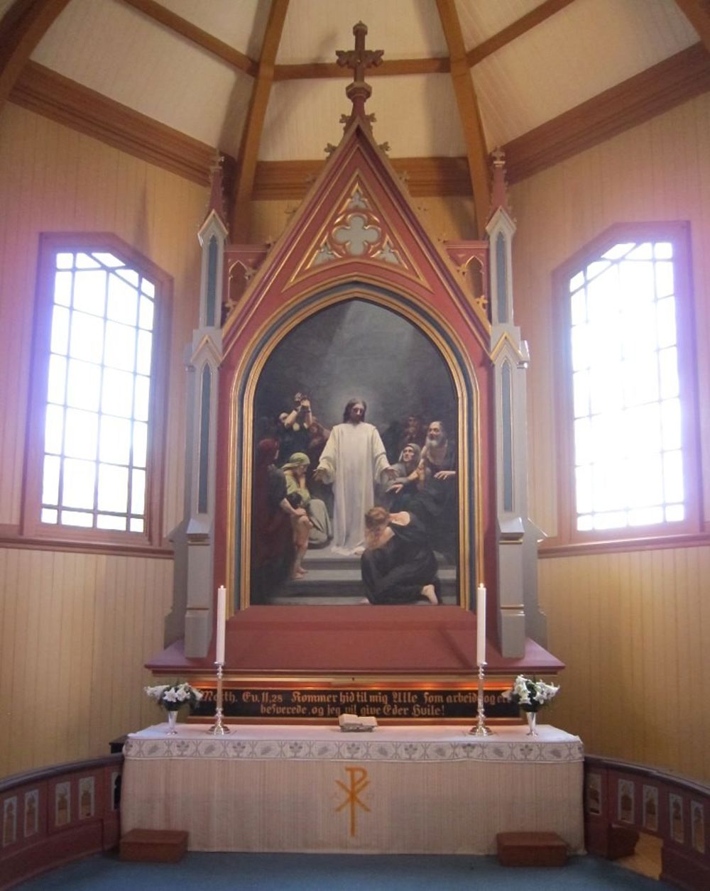 - Altertavlen er malt av Asta Nørregaard som bare var 30 år da hun malte det i 1883. Inspirasjonen til bildet fant hun i Jessaja 62, 1-2 og Luk 4, 17-21. Under maleriet står det "Kommer hid til mig Alle som arbedje og ere besverede, og jeg vil give eder hvile!"