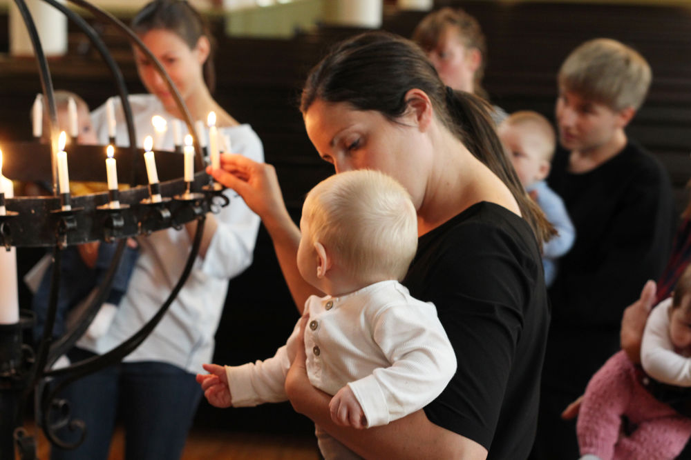 Tilbake til Vår Frelsers kirke, hvor den store, blå teltduken hentes fram. Den blir løftet opp og ned over de små. Etterpå tennes et lite lys for hver av babyene i lysgloben som står på gulvet. En for Evert, en for Noah og videre for Mona, Selma, Phillip og Alma. Et lys tennes også for Jonas, som denne gang har valgt å sove seg gjennom hele babysangen.