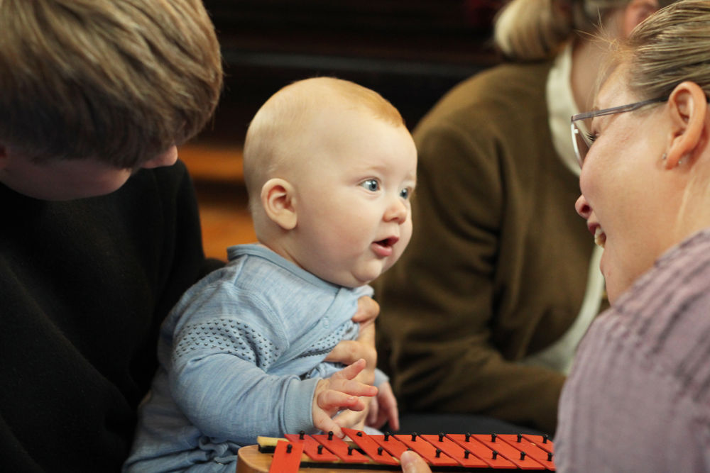 Trosopplæringsmedarbeider Silje Nesheim Dahl starter forsiktig med et lite klokkespill, og tar runden til hver enkelt liten besøkende. Ingenting å si på fascinasjonen til de små. Så følger en økt med lett aktivitet på mattene med babyer som får kjenne på hvordan det er å sveve. Oppe ved alterringen blåses såpebobler, og døpefonten fungerer for anledningen som tromme. En liten samlingsstund på stolene roer det hele ned, før de blå mattene igjen inntas og fargerike slør skaper ny fascinasjon i babyansiktene.