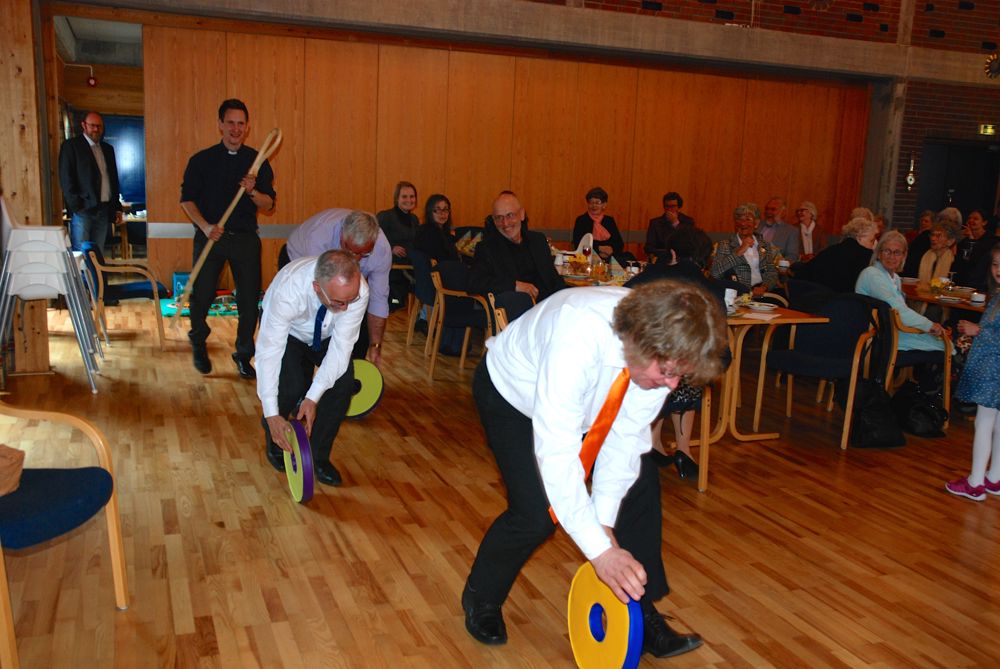 - Kjære Sveinar, vi har lyst å gi deg en utfordring! Som sagt er vi ferdige med å grine nå. Og vi vet du også liker å konkurrere og leke, sa nestleder i menighetsrådet Helene Breivik Hellerdal, som sammen med Jon Erik Strand hadde laget en nokså komplisert hinderløype oppe på podiet.