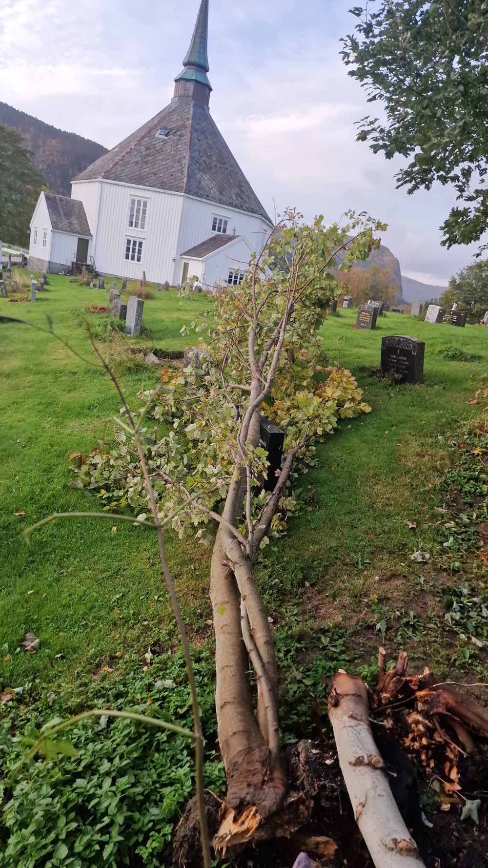 Vi har dialog med Heim kommune om opprydding. De nedfalte greinene er nå ryddet bort og det er ikke avdekket noen skader på gravminner.