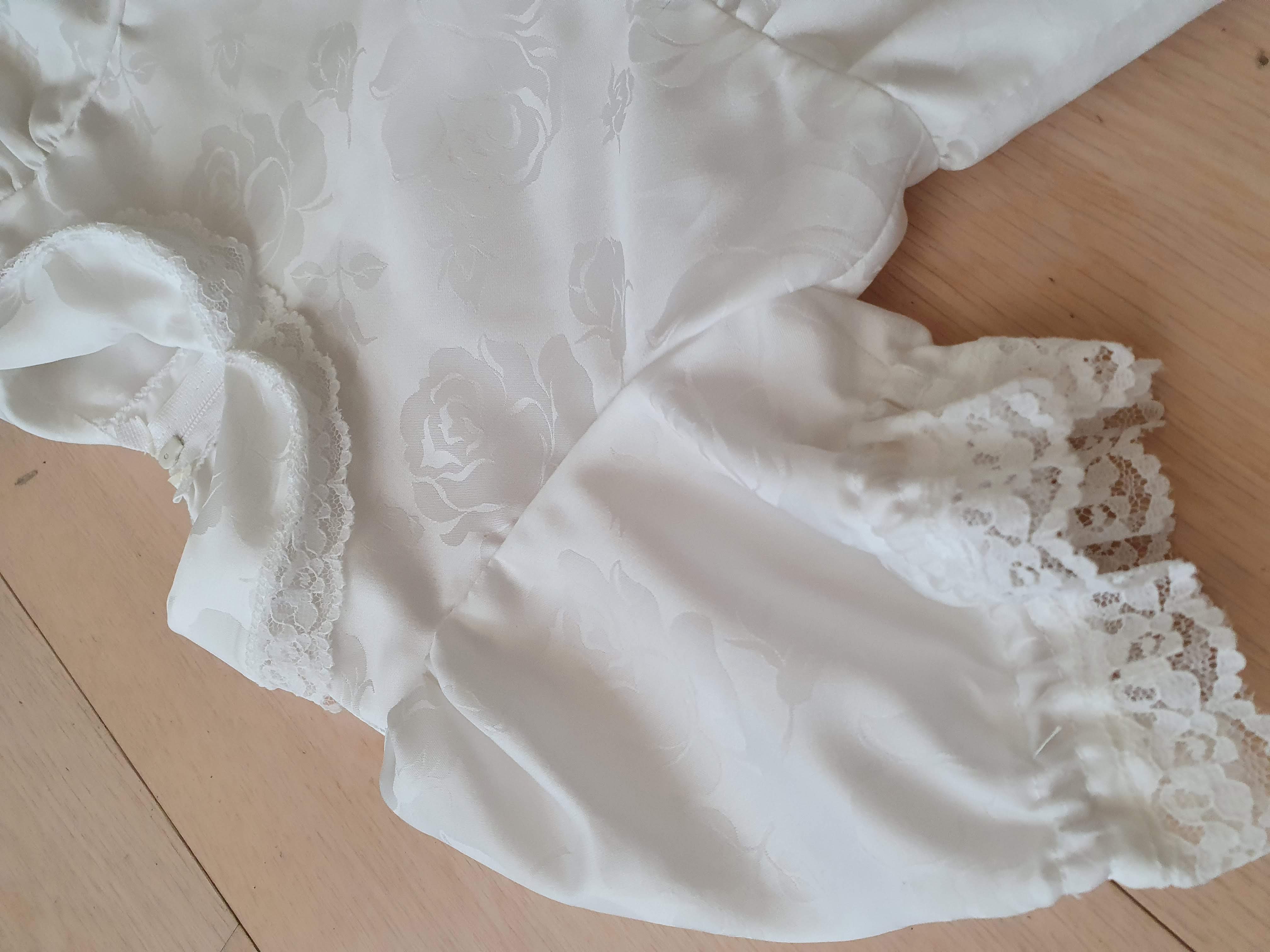 Denne dåpskjolen har vært brukt ved fødeavdelingen på Askim sykehus. Fødeavdelingen åpnet i 1965 og ble lagt ned i 1985. Kjolen er gitt til oss av Anne Karin Gillingsrud som da jobbet på føden til den ble nedlagt. Hun begynte i butikk og hadde utleie av dåpskjoler, derfor fikk hun dåpskjolen da de ryddet føden.