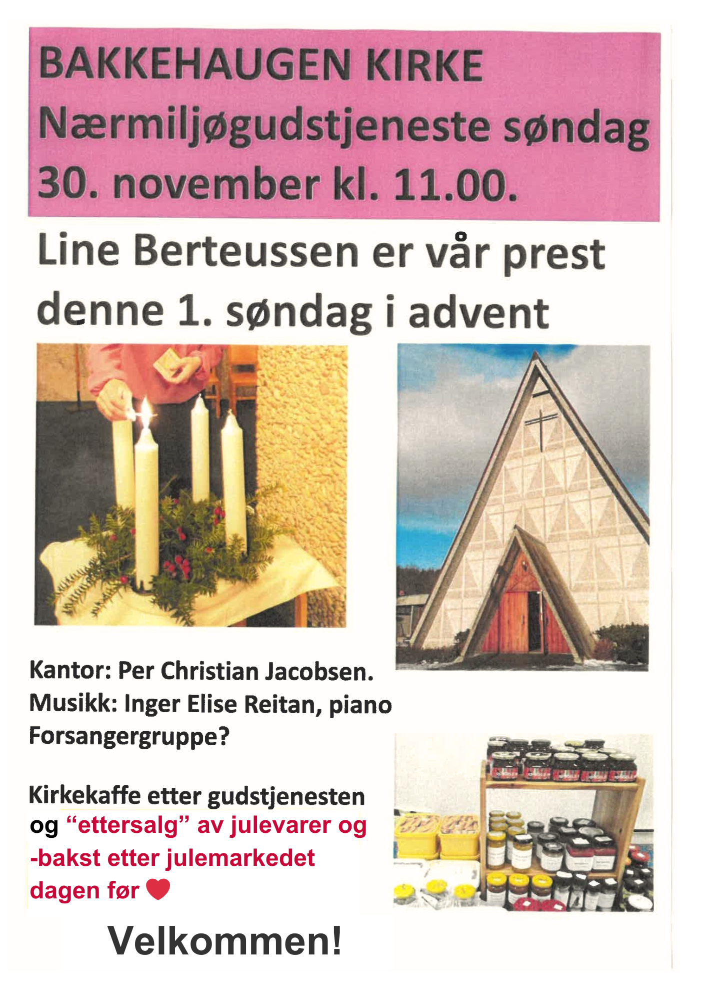 Det blir Nærmiljøgudstjeneste i Bakkehaugen kirke søndag 30. nov kl. 11:00