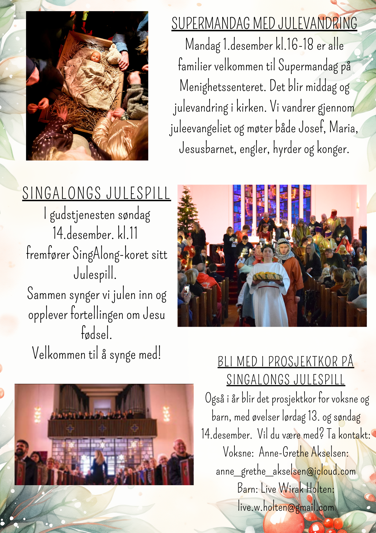 Det skjer mye i Grefsen kirke i adventstiden - konserter med lokale korps og kor, Supermandag med julevandring, gudstjenester og SingAlongs julespill. Les mer her