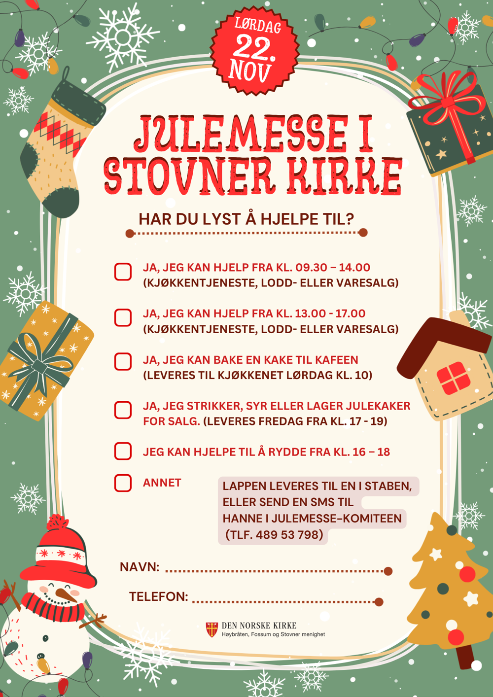Vi inviterer til den tradisjonelle julemessen i Stovner kirke lørdag 22. november kl.10.00-17.00! Det blir klassisk julemesse med strikkeprodukter, søm, julepynt, julekaker og andre godsaker. Vi satser på et bugnende kafèbord, åre-salg, barnelotteri og hovedlotteri. Det blir Korsang med St.Laurentiuskoret og Stovner Skolekor sørger for god julestemning.