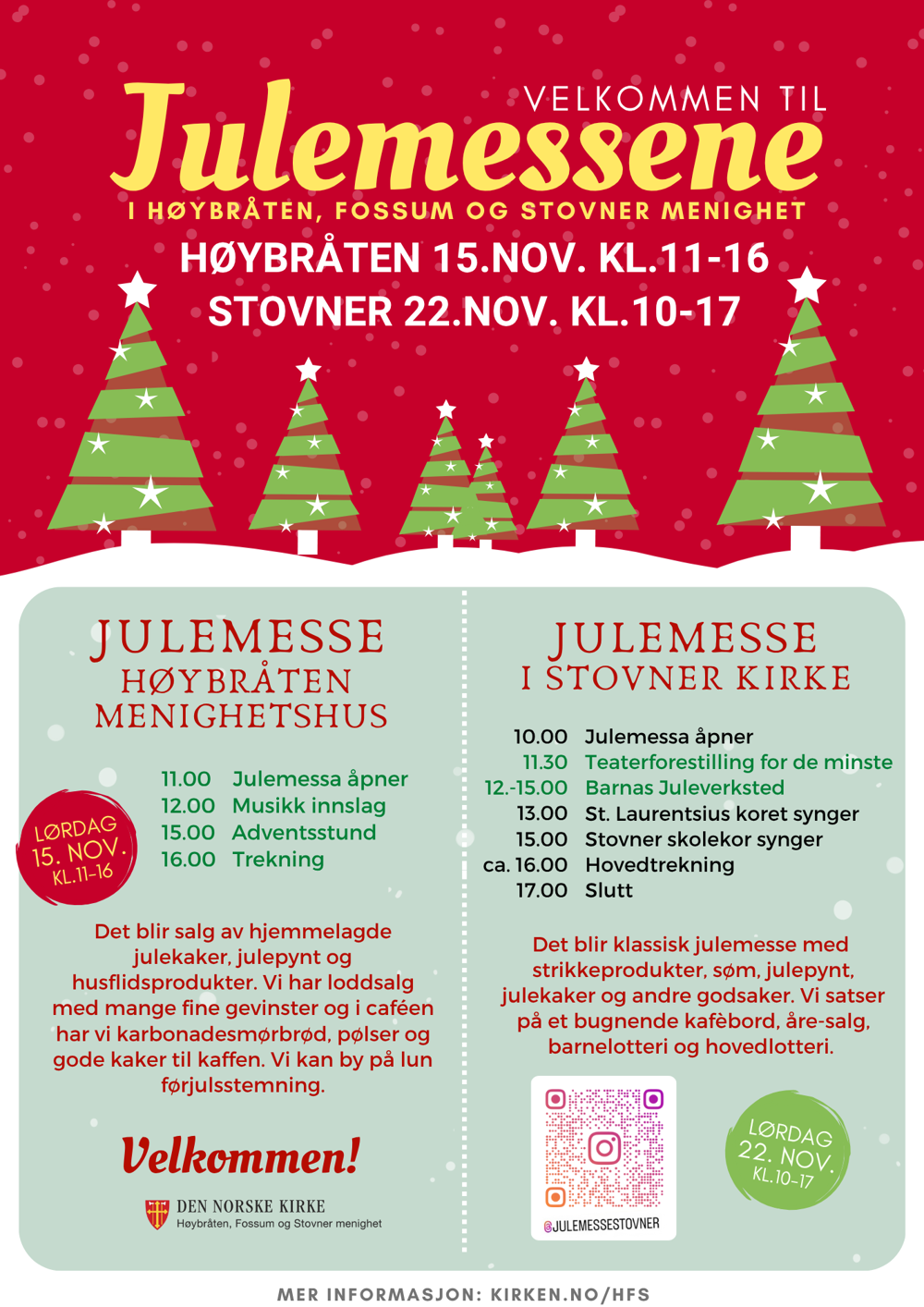 Velkommen til den årlige julemessa i Høybråten menighetshus. Vi kan by på lun førjulsstemning med fine gevinster, åresalg, salgsbod med bl.a. tradisjonsrike julekaker og mengder av håndarbeid. Det blir cafe med smørbrød, pølser og gode kaker. Lokale aktører byr på underholdning i løpet av dagen.