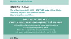 10.5.2023Her kan du få en oversikt over gudstjeneste og annet som skjer i mai!