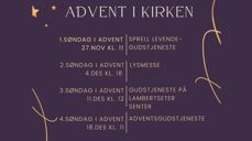 1.12.2023Velkommen til gudstjenester i advent og jul. Her ser du programmet for hva som skjer.